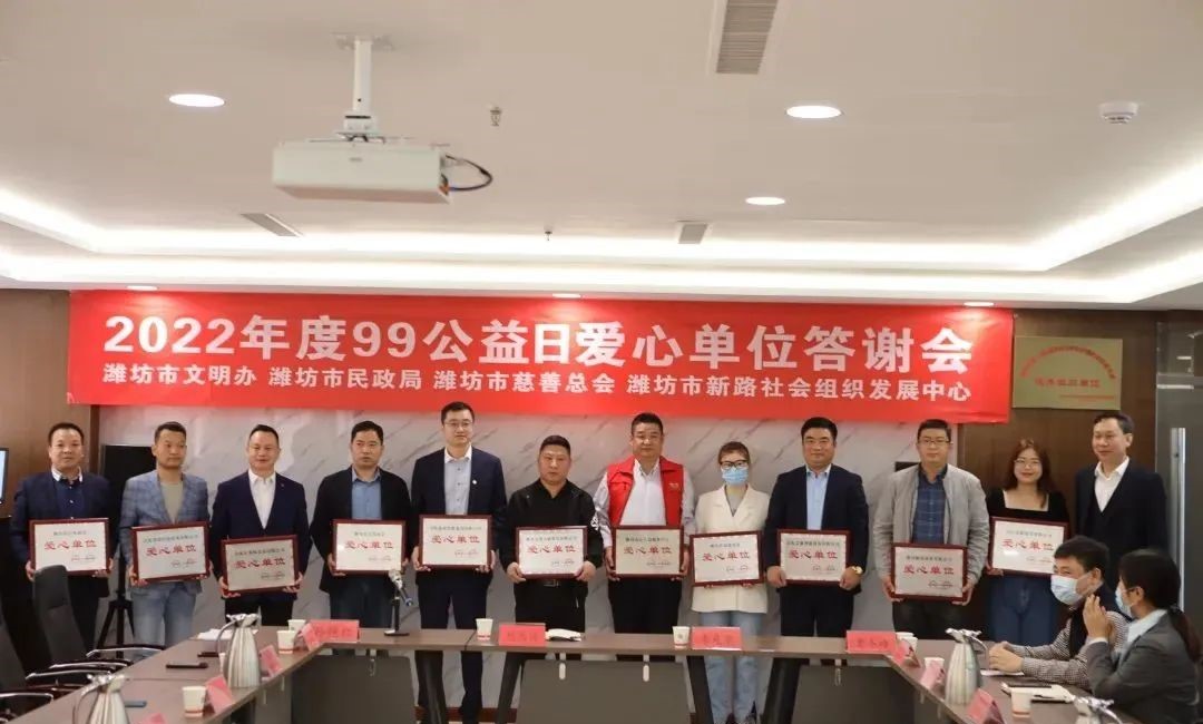 2022年10月13日上午,山東省安全產(chǎn)業(yè)協(xié)會以及會長單位濰坊市平安消防工程有限公司受邀參加由濰坊市文明辦、濰坊市民政局、濰坊市慈善總會、濰坊市新路社會組織發(fā)展中心舉辦的2022年度99公益日愛心單位答謝會活動。出席本次答謝會領(lǐng)導有: